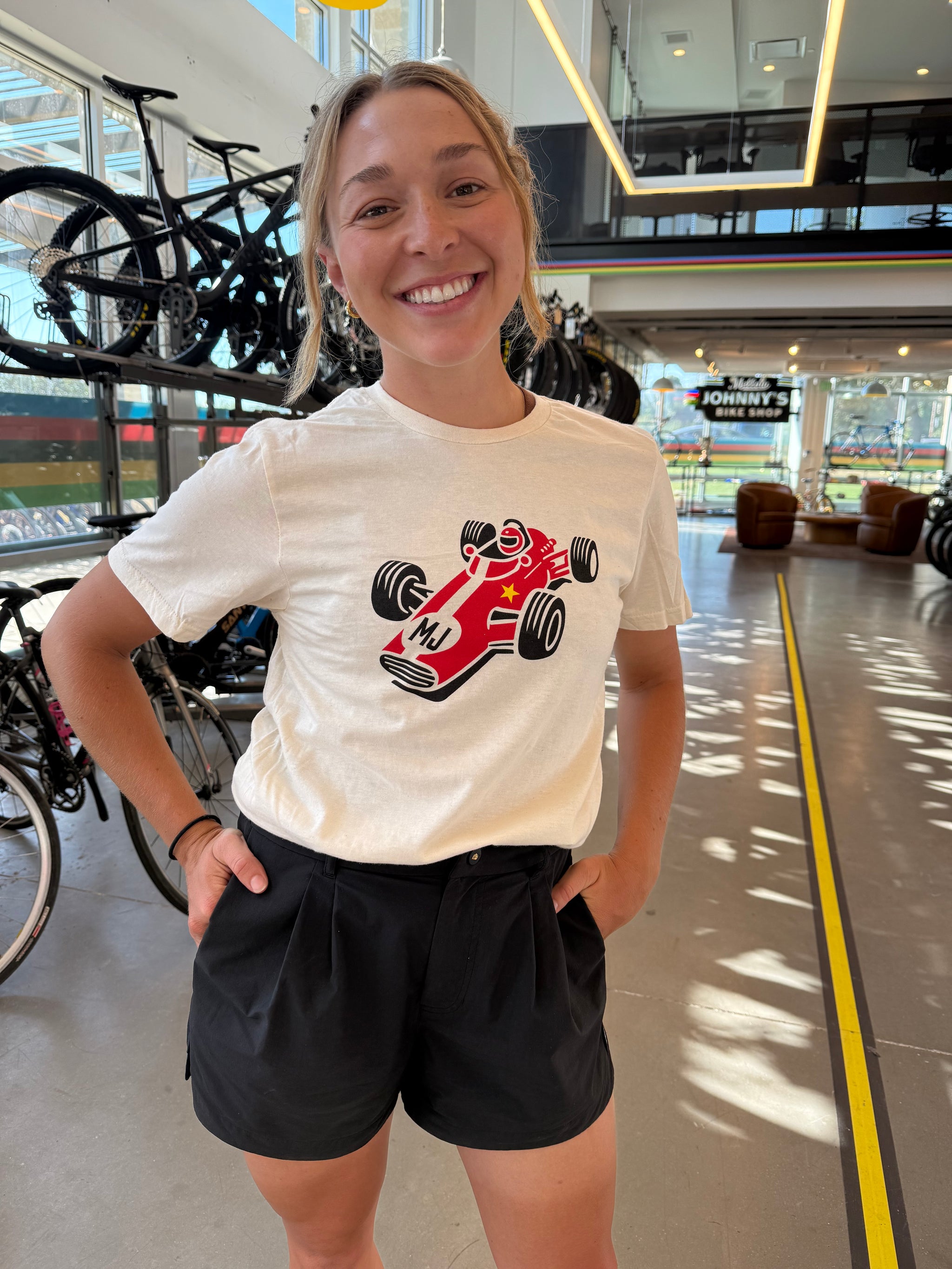 The MJ's '53 tee is a limited edition, 100% cotton, natural color tee printed here in ATX that's an homage to racing. Show your love of racing sitting in the grand stands or roadside at the local crit.