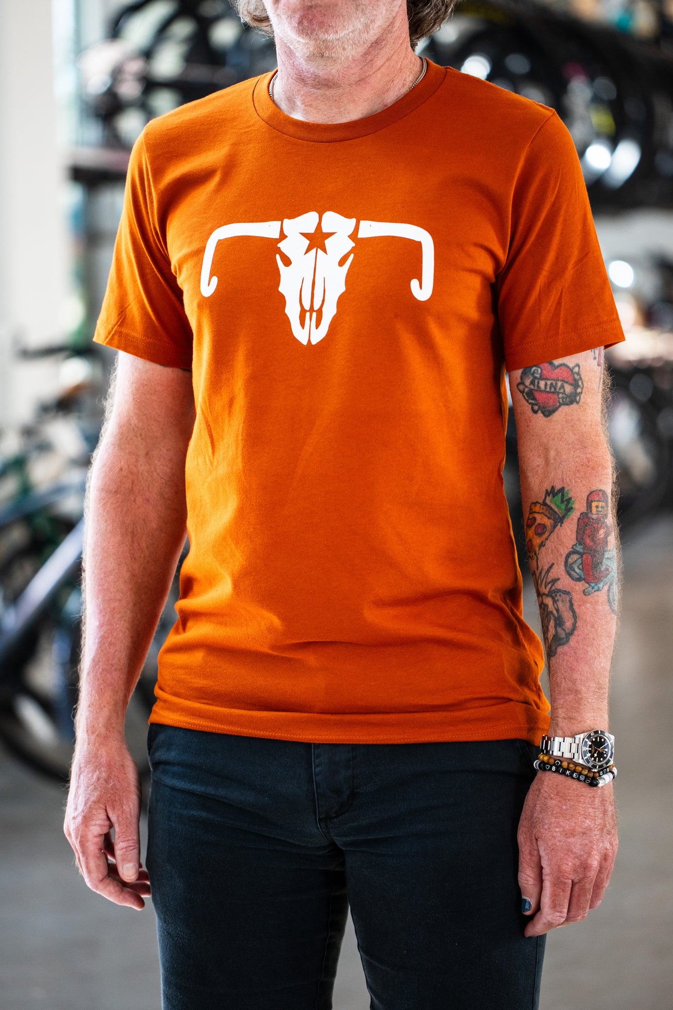 It's been a long time coming. The Burnt Orange Cow Skull Tee. Our second most popular design (behind the classic logo tee) now in a burnt orange variant. Printed here in ATX by our pals at Austin Screen printing, the tee is 100% cotton and ready for the eyes of Texas.