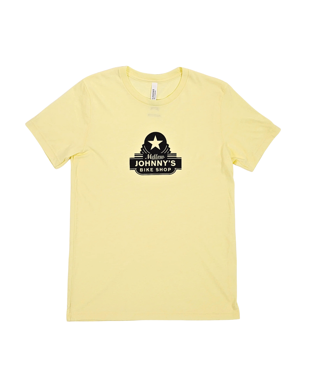 The original tee that we opened the shop with. Heather yellow tri-blend (50% polyester, 25% cotton, 25% rayon) printed with our crest logo in black on the front and the classic star and Austin wordmark on the back near the collar. Designed at our original HQ and modeled by LA for Austin Monthly way back in '08.
